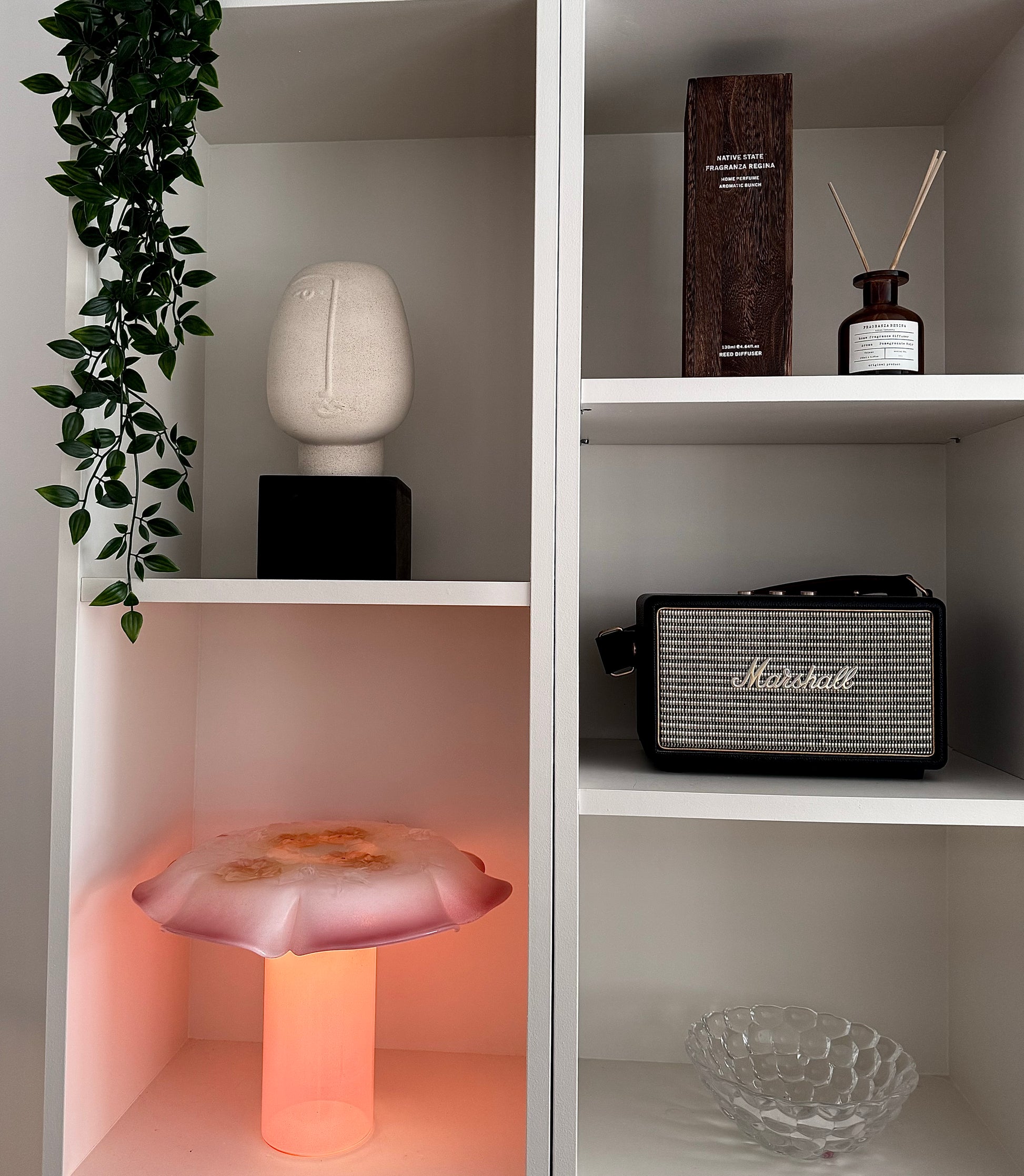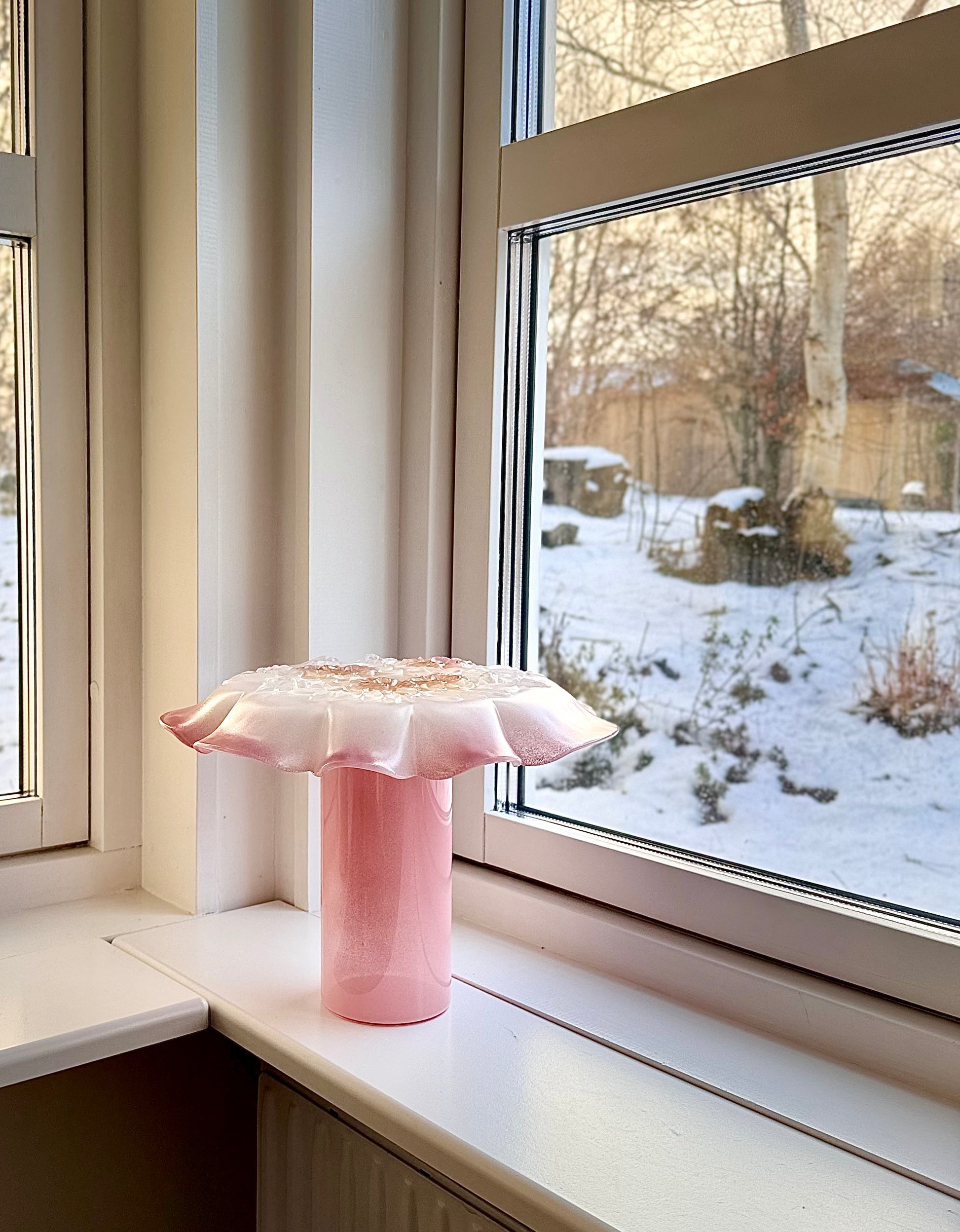 Vackra och somriga Pinky Flower tillhör kollektionen Recycle som innebär att glaset är återbrukat som BRILLIANT ART har givit färg och ett nytt "lysande" liv. Bordslampan ger ett behagligt och mysigt ljus framåt mörka kvällar, också en väldigt vacker dekoration i hemmet mitt på ljusa dagen. Eftersom lampan är sladdlös är den smidig att placera på olika platser i hemmet och dessutom perfekt för de platser som saknar eluttag. Pryd ditt hem med en personlig och unik lampa i bokhyllan, på fönsterbrädan, köksbordet eller sängbordet, låt fantasin flöda.