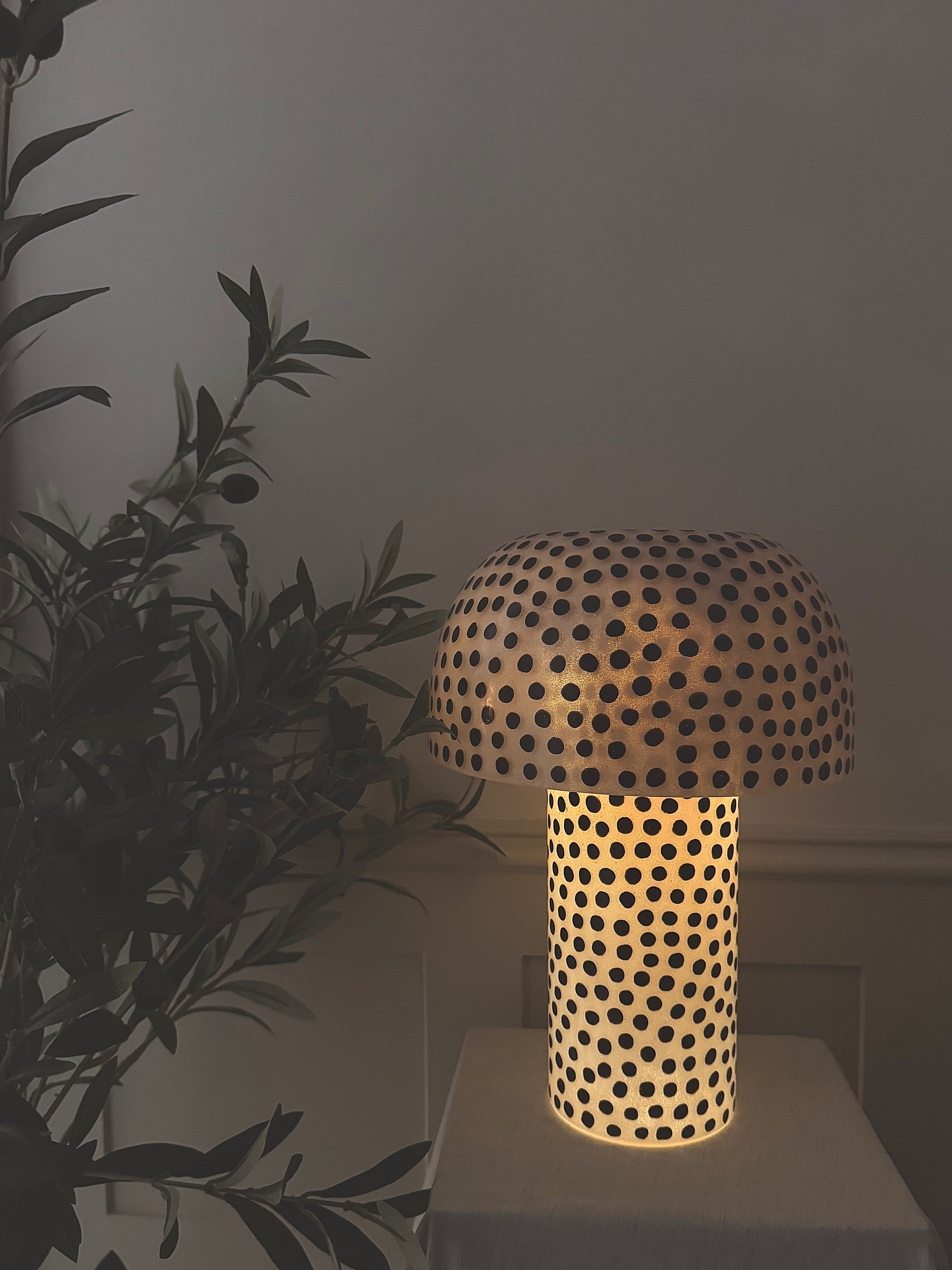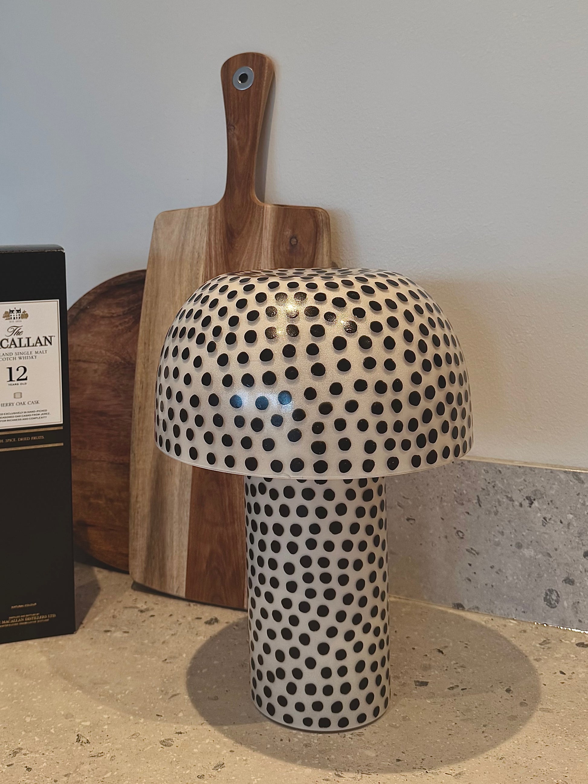 Det finns även ett batteri i kontrollen som enkelt byts ut i framtiden. Eftersom lamporna målas för hand är varje del unik & egen, därför kan det förekomma mindre skiftningar i färg och mönster.