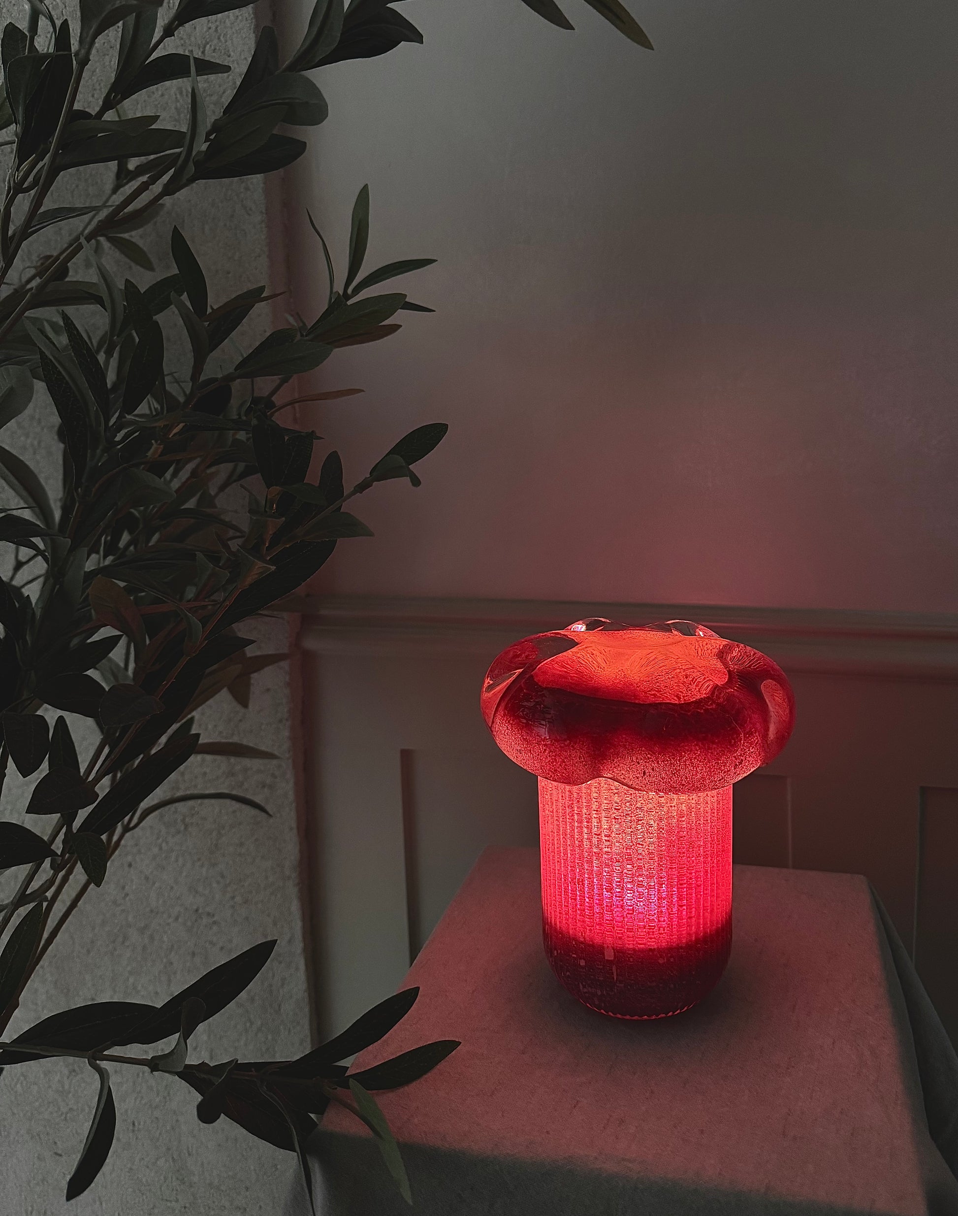 Red Peony tillhör kollektionen Recycle som innebär att glaset är återbrukat som BRILLIANT ART har gett färg och ett nytt "lysande" liv. Bordslampan ger ett behagligt och mysigt ljus framåt mörka kvällar, också en väldigt vacker dekoration i hemmet mitt på ljusa dagen. Eftersom lampan är sladdlös är den smidig att placera på olika platser i hemmet och dessutom perfekt för de platser som saknar eluttag. Pryd ditt hem med en personlig och unik lampa i bokhyllan, på fönsterbrädan, köksbordet eller sängbordet, låt fantasin flöda.