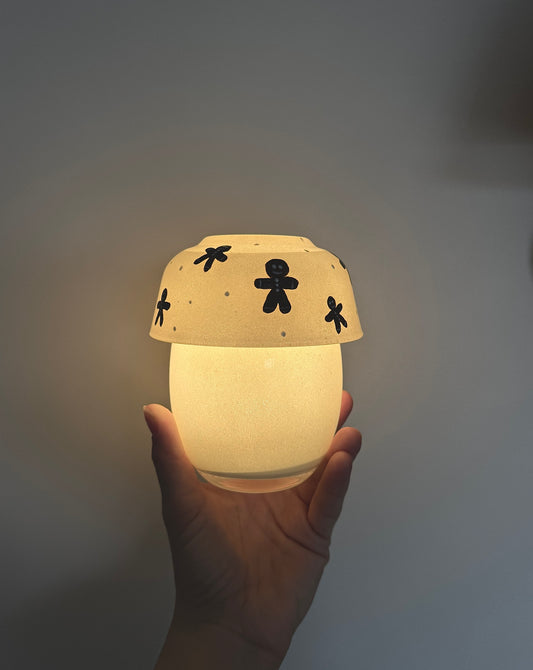 Julkollektion består av minilampor, dessa små gulliga bordslampor har handmålade julmotiv.